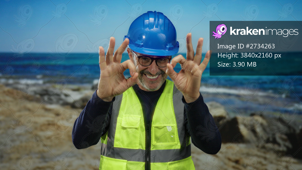 Hispanic man with blue helmet and safety vest giving an okay sign at the beach, smiling confidently by the sea under a clear sky.
