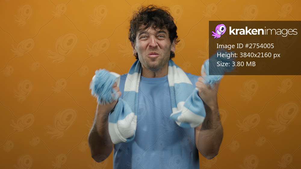 Hispanic man cheering energetically with blue scarf against vibrant orange background showing passion for football and sports.