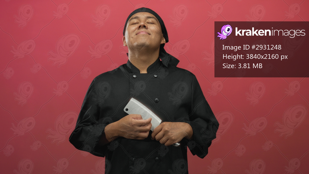 Hispanic man chef in black uniform and bandana holding a cleaver with visible hands and closed eyes in red studio; confidence craft.