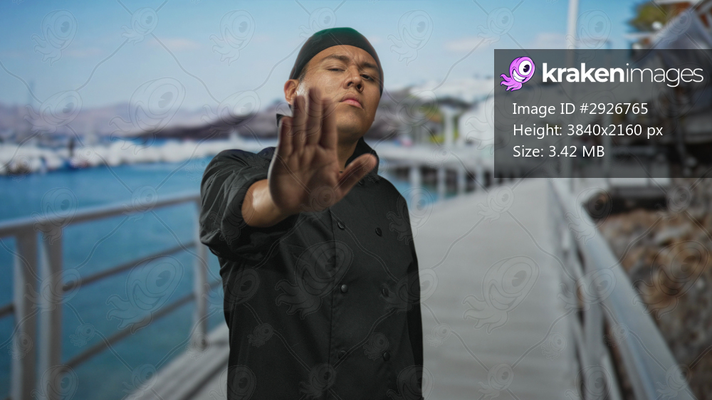 Hispanic man chef in black uniform raises hand in open palm stop gesture on seaside promenade street; refusal boundary.