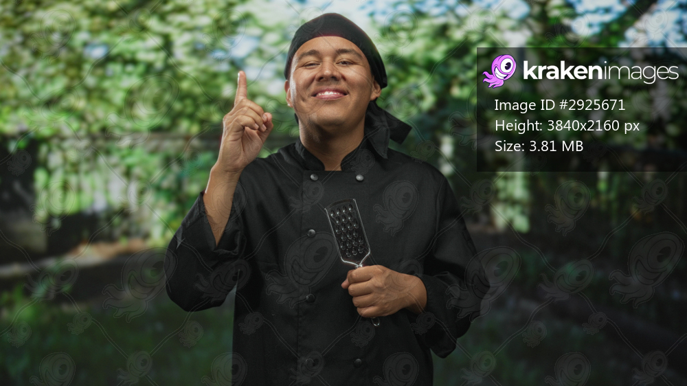 Hispanic man chef in uniform pointing finger and holding grater in park; contentment culinary pride.