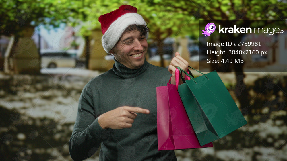Hispanic man with christmas hat in park holding shopping bags and giving thumbs up, expressing happiness and holiday spirit.