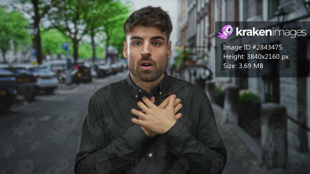 Hispanic man clutching chest with both hands on bustling city street next to parked cars; fear anxiety.