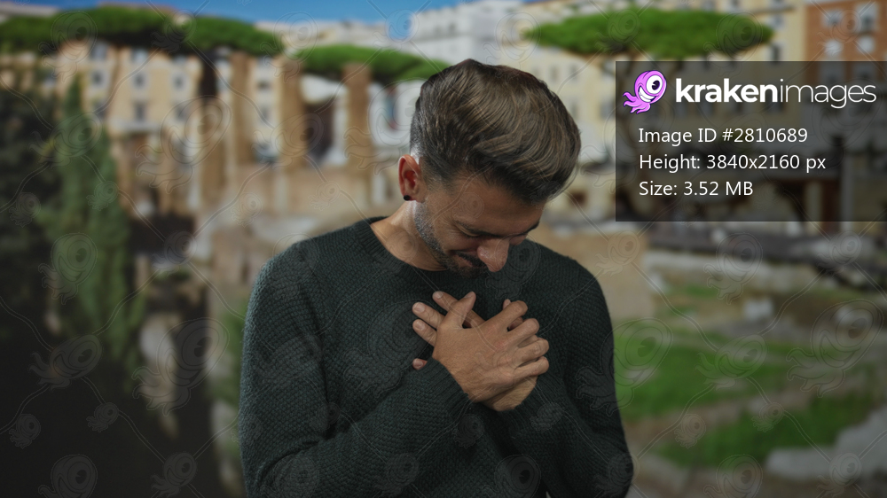 Hispanic man clutching chest in roman ruins with weathered marble columns and sunlit stone pathways reflecting ancient history; pain.
