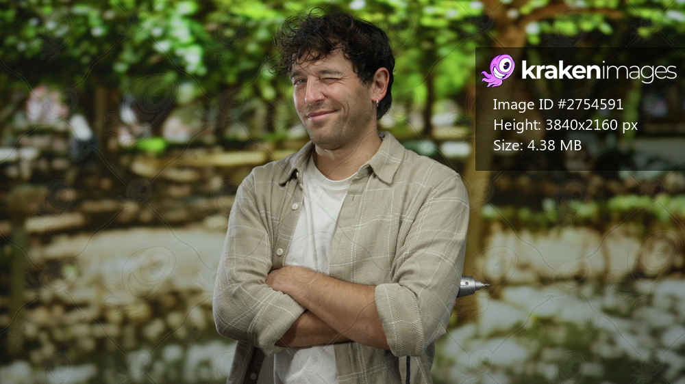 Hispanic man confidently standing in a lush green park with crossed arms, exuding charm and warmth, surrounded by vibrant trees and sunlight filtering through leaves. - Kraken Images