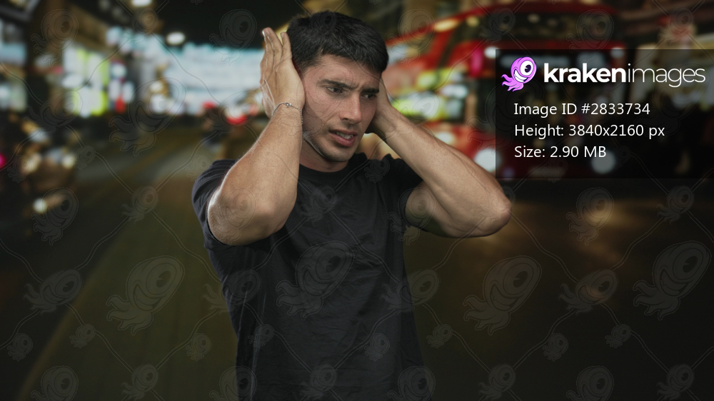 Hispanic man covering ears with hands as a red bus approaches on busy dimly lit city street; discomfort.