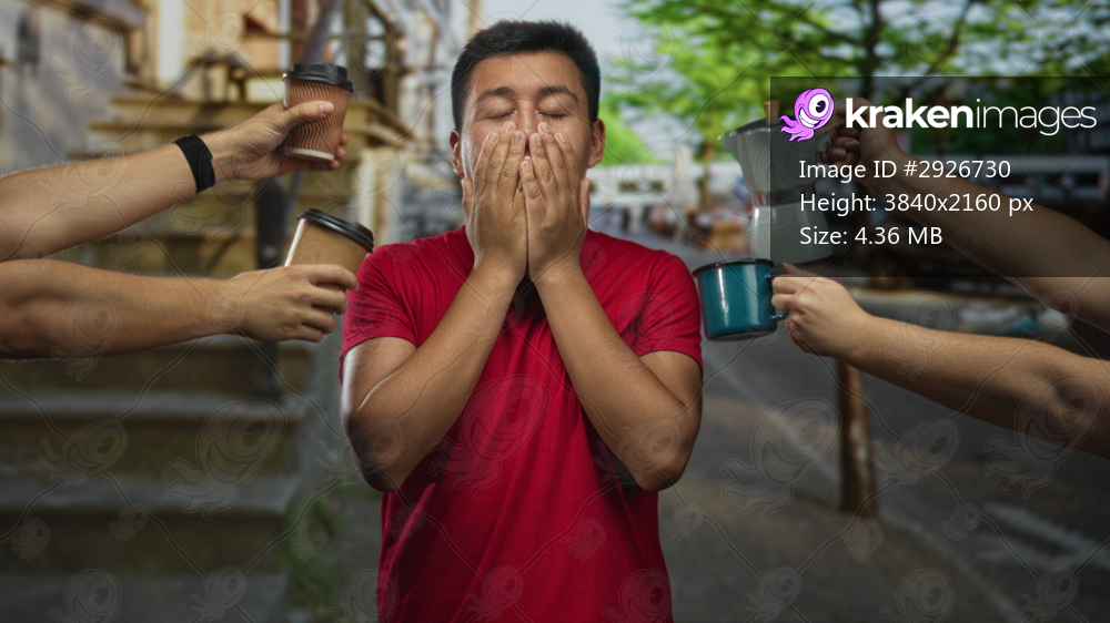 Hispanic man covers face with hands on street as several hands offer takeaway coffee cups and a moka pot; stress morning ritual.