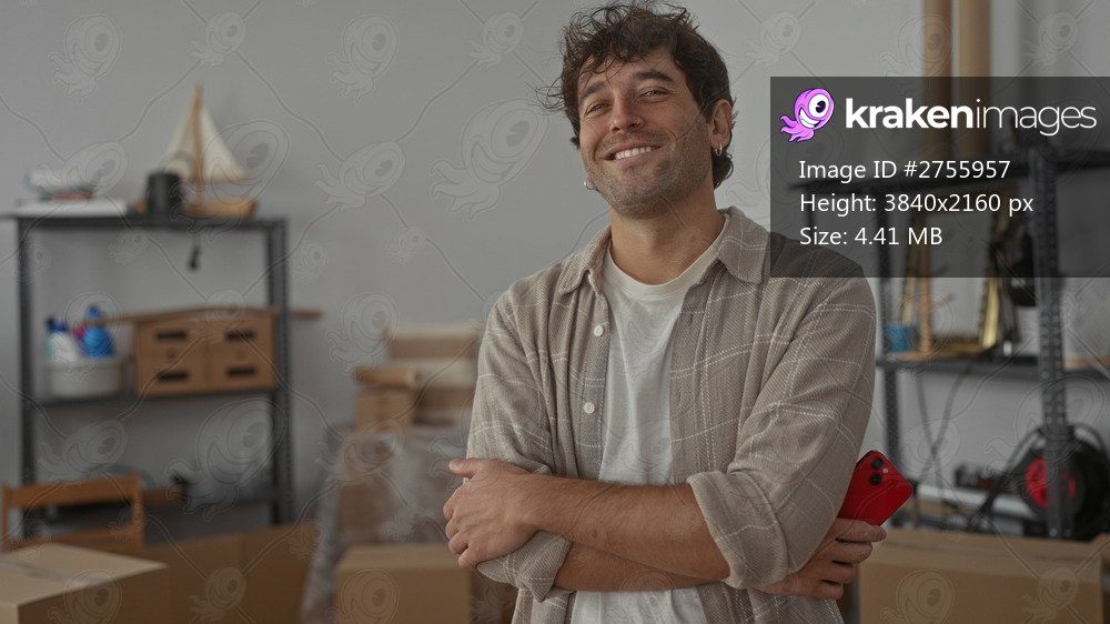 Hispanic man with crossed arms holding red phone in newly moved home surrounded by unpacked boxes and shelves.