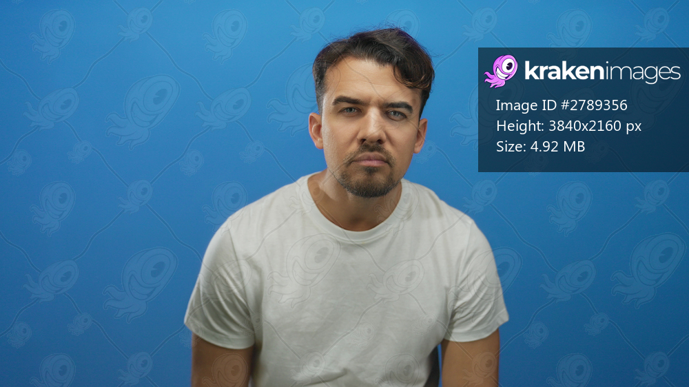 Hispanic man with curious expression stands against an isolated blue background wearing a casual white shirt.