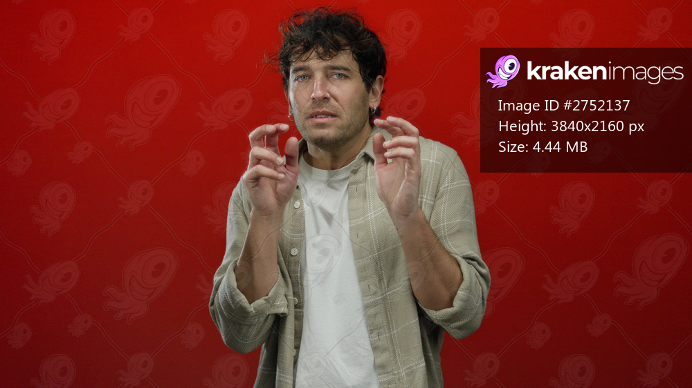 Hispanic man with curly hair expressing fear against a vivid red background, wearing a casual plaid shirt and making a defensive gesture with his hands and arms crossed. - Kraken Images
