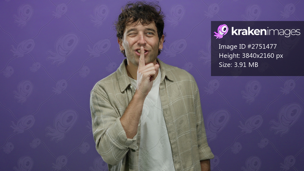 Hispanic man with curly hair making hush gesture against purple backdrop wearing casual shirt and earrings implying secrecy or silence