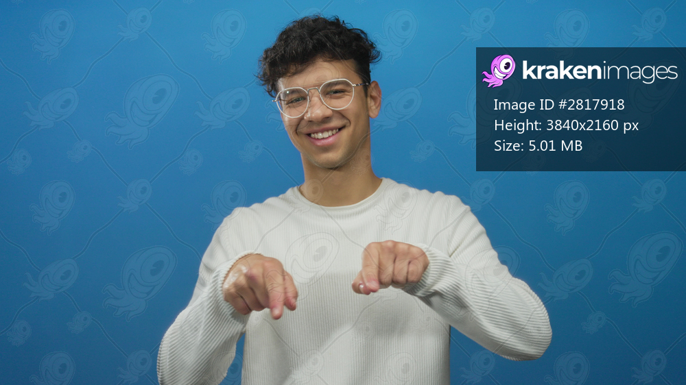 Hispanic man with dark curly hair and glasses finger pointing forward in blue studio; fun energy creativity.