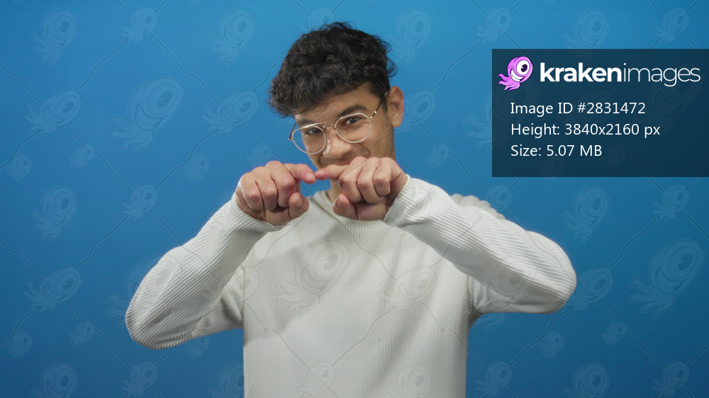 Hispanic man with dark curly hair and glasses finger pointing forward in blue studio; fun energy creativity.