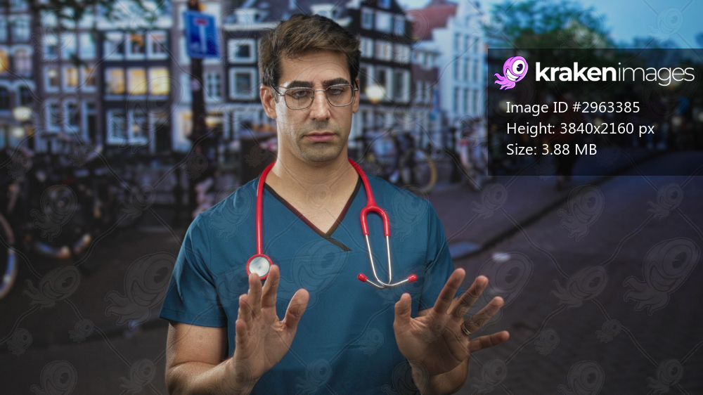 Hispanic man doctor in blue scrubs with red stethoscope holds palms out facing camera on cobbled street; concern caution safety empathy.