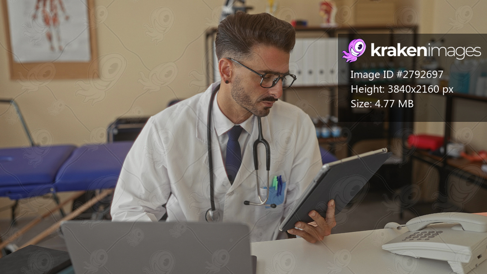 Hispanic man doctor in white coat holds tablet and types on laptop in clinic; professional concentration.