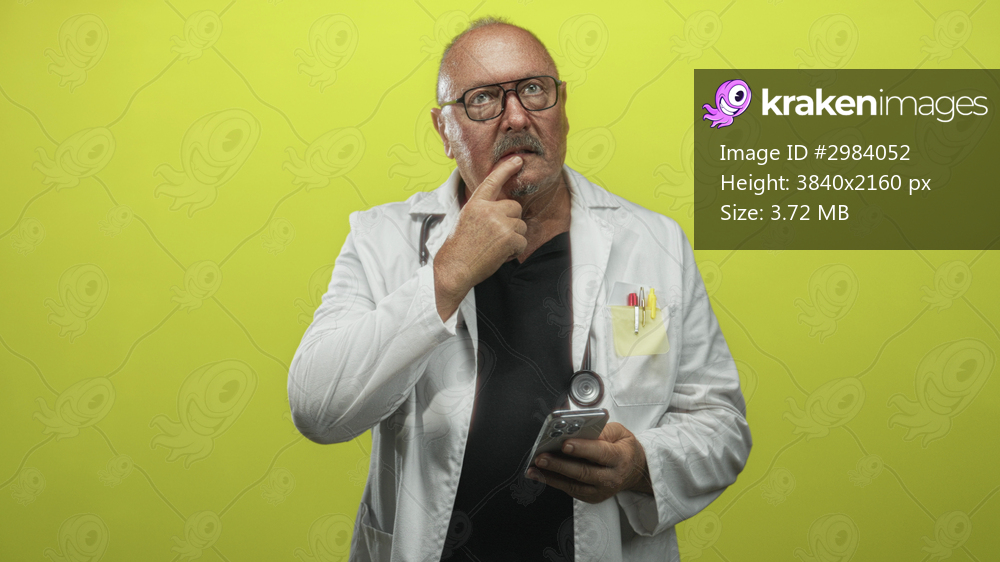 Hispanic man doctor in white coat with stethoscope and pens taps smartphone and puts finger to lips in studio; thoughtful deliberation.