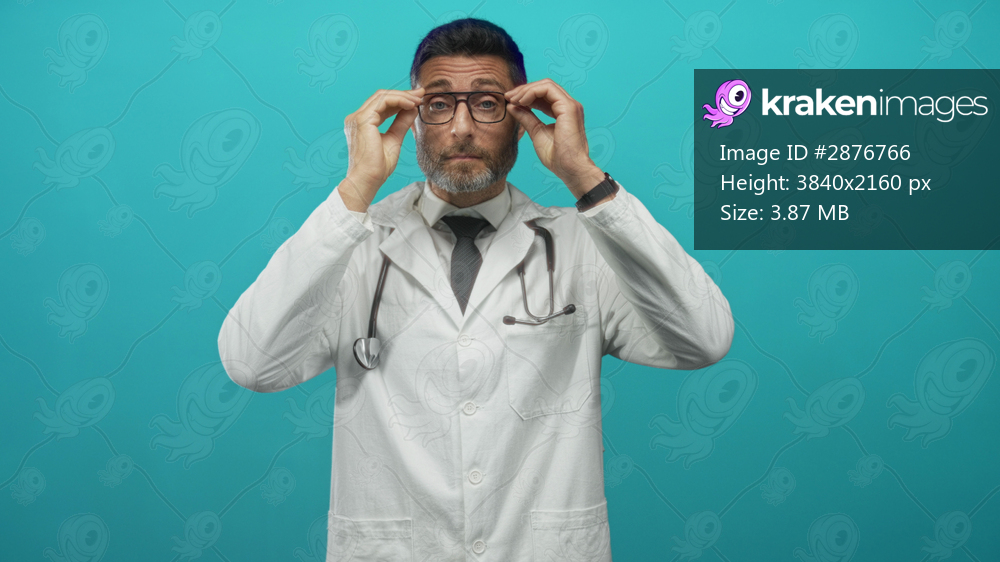 Hispanic man doctor with stethoscope adjusting glasses in turquoise studio; confidence professionalism care.