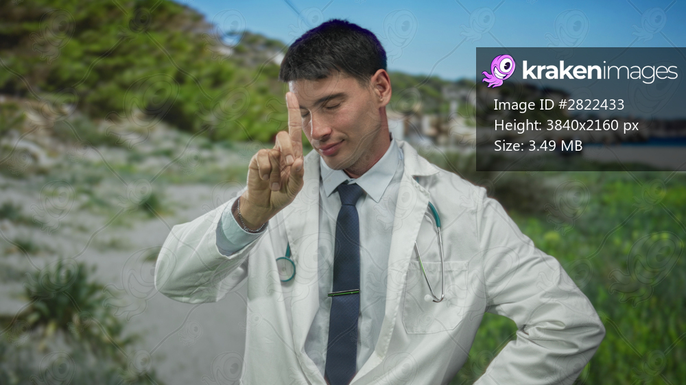 Hispanic man doctor wearing a stethoscope in white coat points finger upward in a lush green park under bright sunlight; authority.