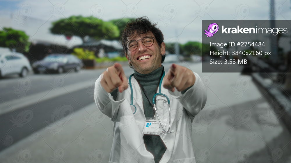 Hispanic man dressed as a doctor outdoors on a street points playfully at the camera, creating a lively and approachable urban medical scene.