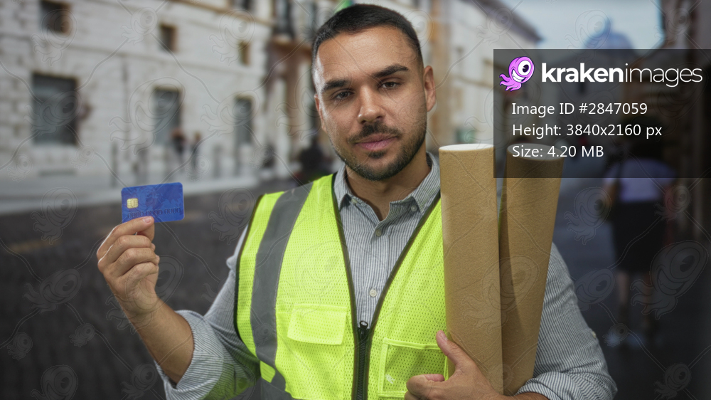 Hispanic man engineer in reflective vest holds creditcard while clutching rolled plans on city street; confidence.