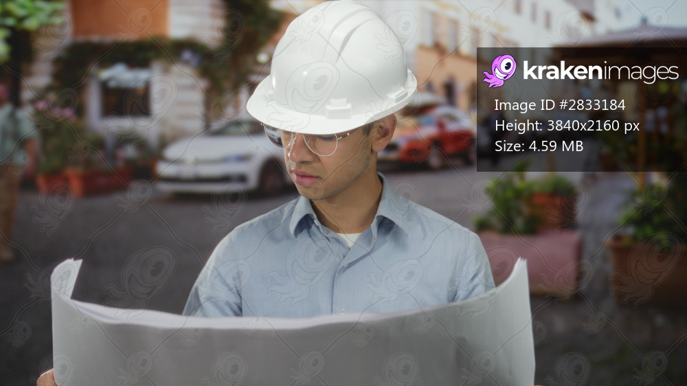 Hispanic man engineer wearing hardhat and glasses reads large rolled blueprint on sunny city street; concentration.