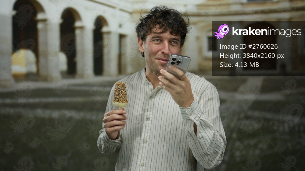 Hispanic man enjoying ice cream while looking at his phone, standing in front of grand roman columns on a university campus.