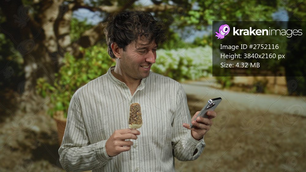 Hispanic man enjoying ice cream while smiling at his phone in a picturesque park setting with lush greenery.