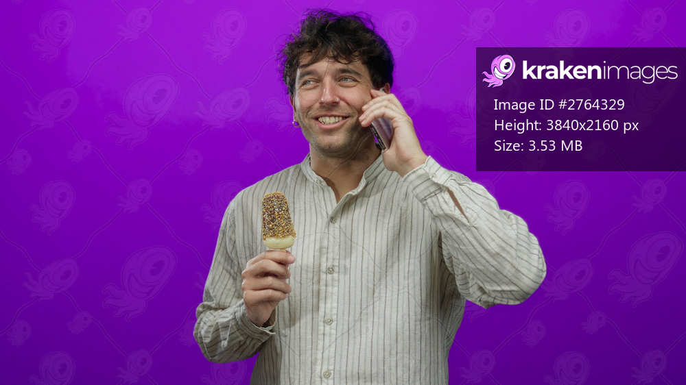 Hispanic man enjoying ice cream while talking on phone against vibrant purple background, capturing a relaxed and happy moment.