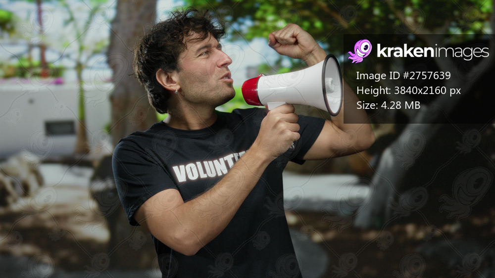 Hispanic man enthusiastically volunteering with a megaphone outdoors, expressing motivation and energy on a sunny street.