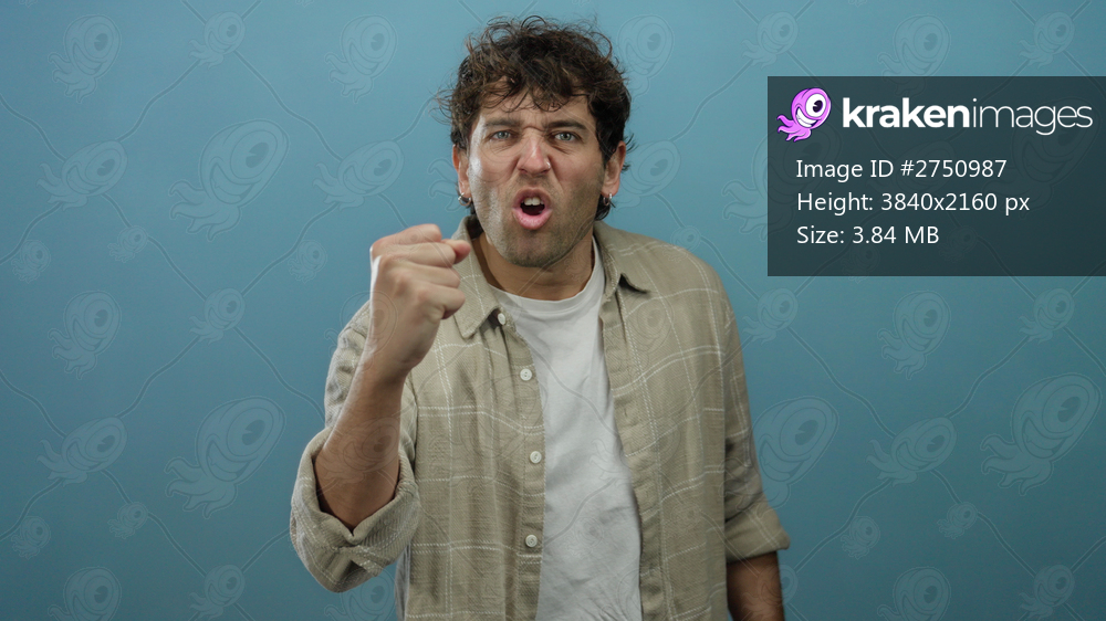 Hispanic man expressing frustration with a clenched fist against a blue background.
