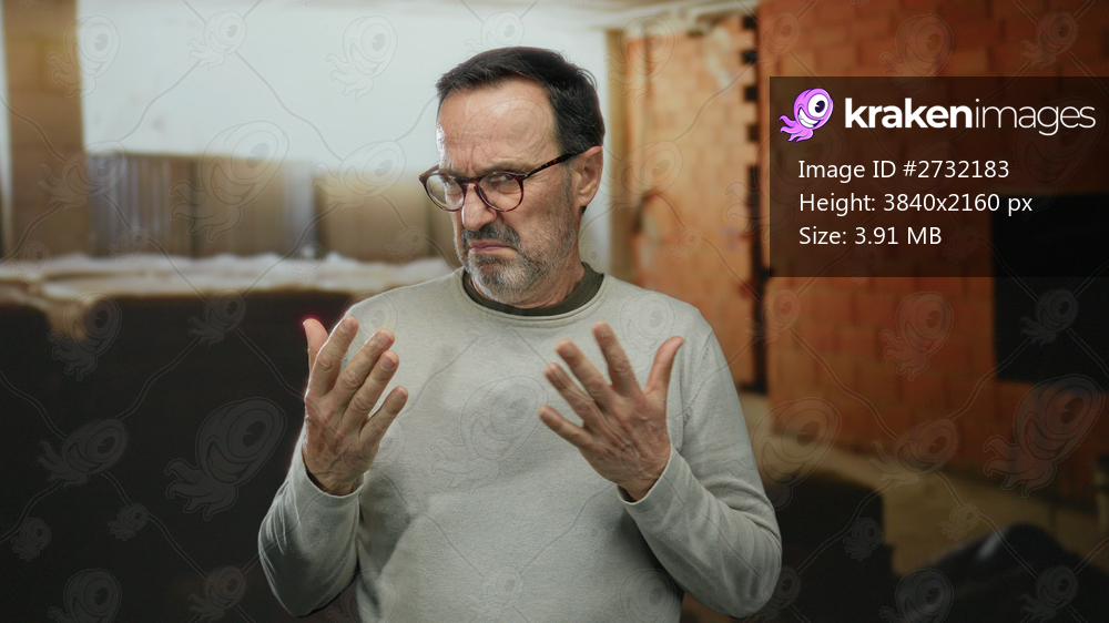 Hispanic man expressing frustration at a construction site indoors with bare brick walls, conveying a sense of displeasure and confusion.