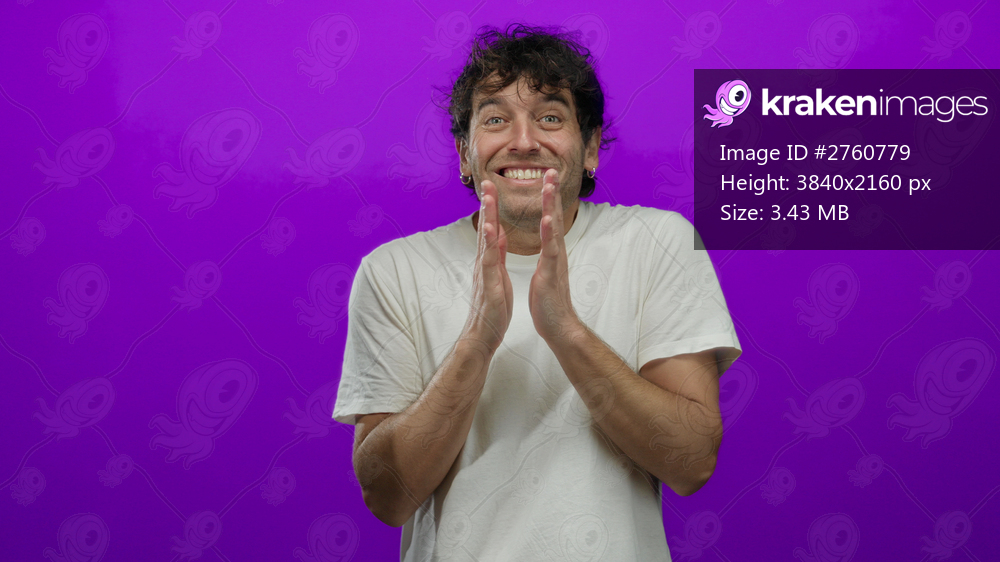Hispanic man expressing joy with a wide smile and clasped hands against a vibrant purple background wearing a casual white shirt.