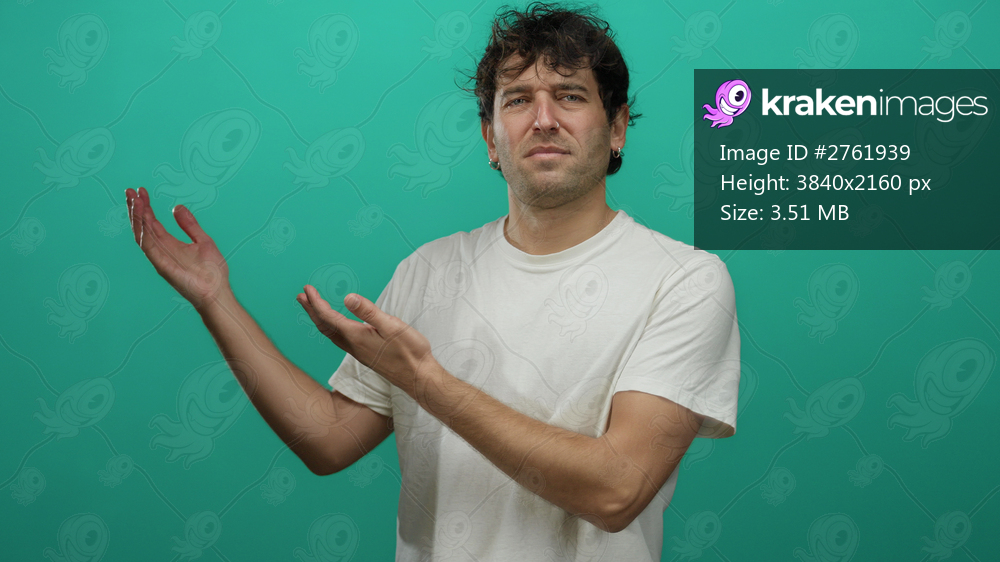 Hispanic man extends arms sideways against a vibrant green background expressing confusion with a questioning look wearing a casual white t-shirt suggestive of uncertainty - Kraken Images