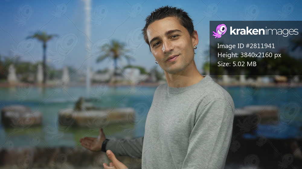 Hispanic man extends his arms backward wearing a gray sweater to present a stone fountain in a forest setting; confidence.