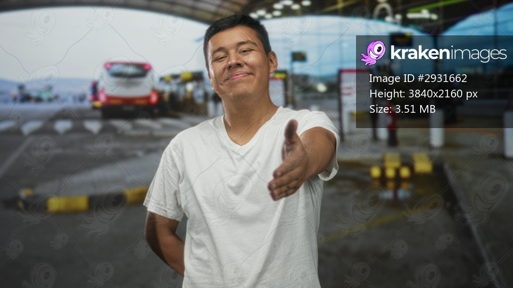 Hispanic man extends right hand for handshake at airport terminal outdoors, smiling and offering a greeting; friendly welcome.