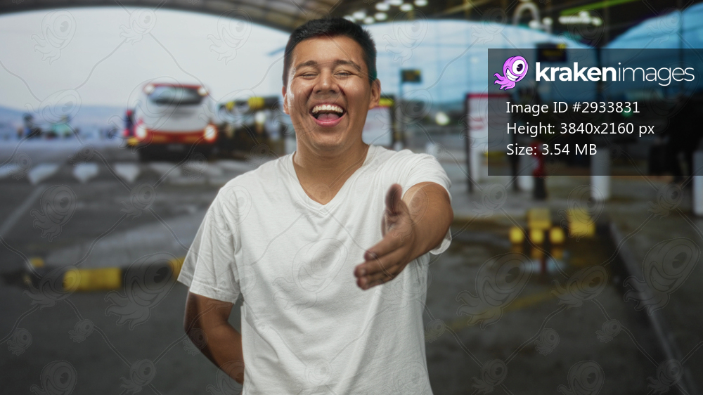 Hispanic man extends right hand for handshake at airport terminal outdoors, smiling and offering a greeting; friendly welcome.