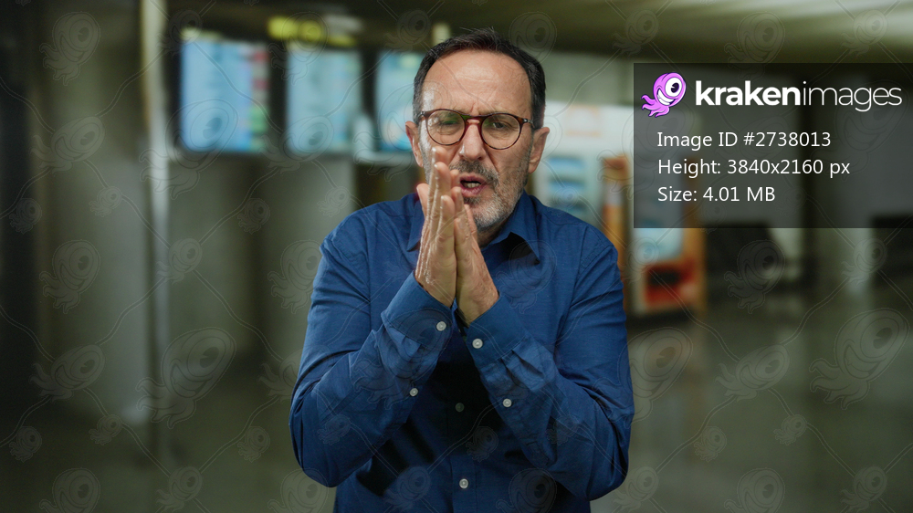 Hispanic man feeling cold in an indoor airport terminal, wearing a blue shirt and glasses, with flight information screens and seating visible in the background. - Kraken Images
