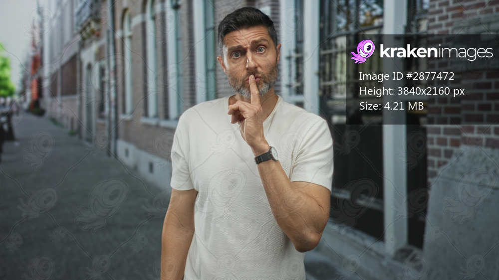 Hispanic man with finger to lips for silence on a city street wearing white t shirt and wristwatch near brick building; silence.