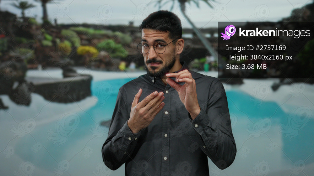 Hispanic man gestures in a serene outdoor pool setting at a luxury resort, surrounded by lush greenery and tropical ambiance.