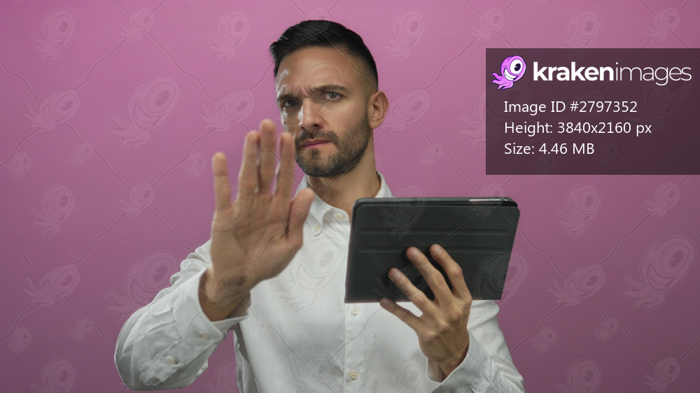 Hispanic man gesturing okay holding tablet against pink background showcasing young adult with technology interaction