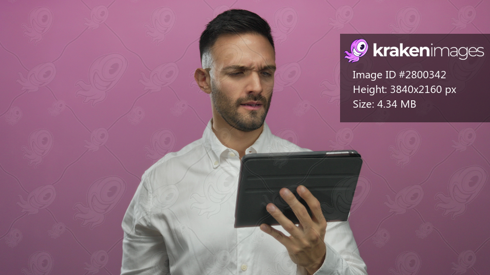 Hispanic man gesturing okay holding tablet against pink background showcasing young adult with technology interaction