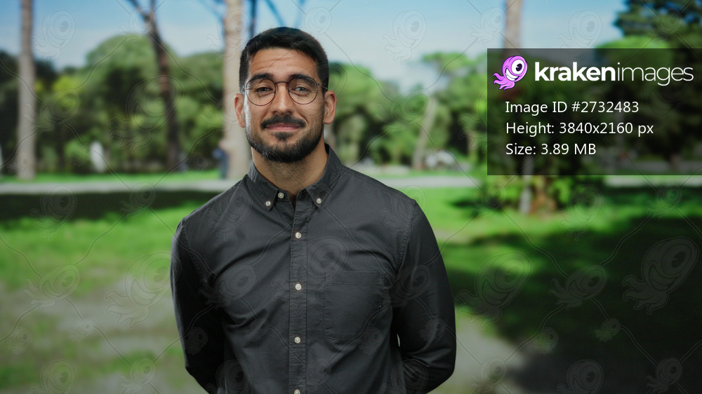 Hispanic man with glasses in a park setting, wearing a dark shirt, showcasing confidence and style beneath the sun-dappled trees on a sunny day.