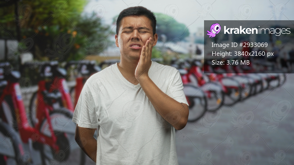 Hispanic man with hand on cheek and toothache at bike rental parking on street with row of docked bikes visible; toothache pain.