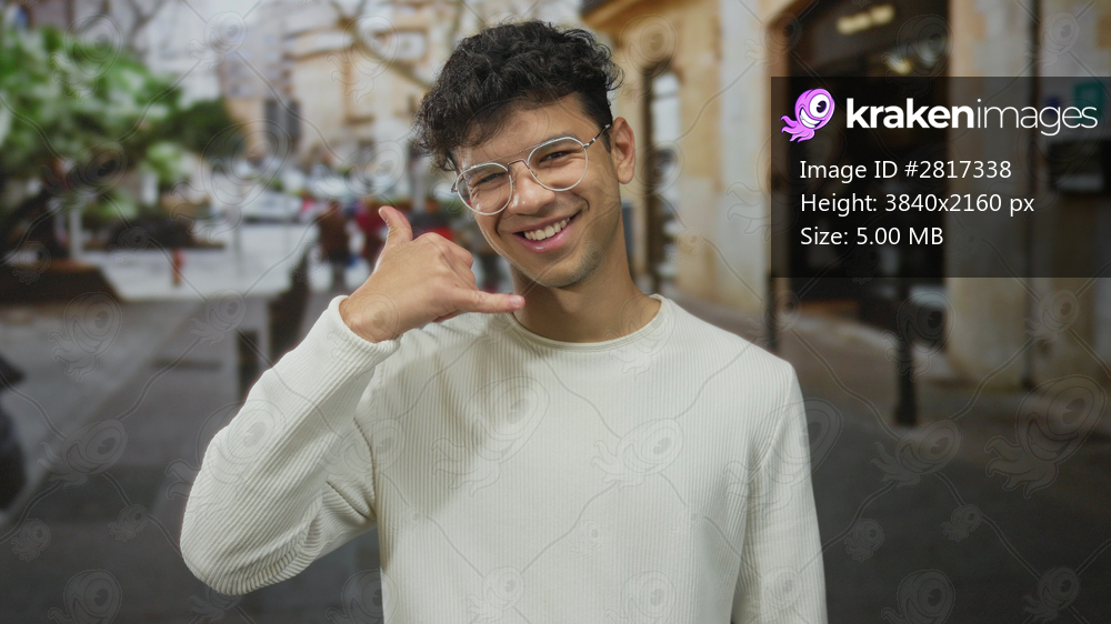 Hispanic man hand raised in call gesture stands smiling in bustling urban street amid blurred pedestrians; social connection.