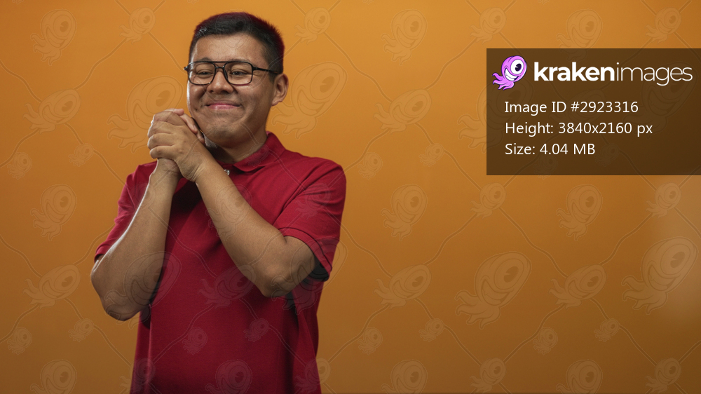 Hispanic man with hands clasped near face smiling in studio with orange backdrop; warmth gratitude joy.