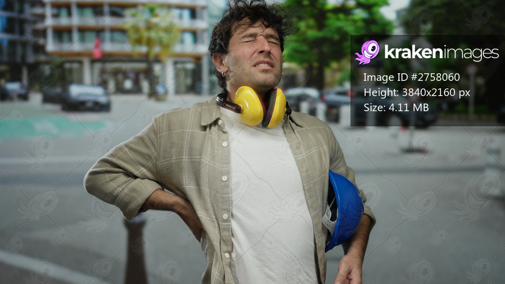 Hispanic man with headphones and hardhat stands on street clutching his back, showing discomfort while wearing casual clothing in an urban outdoor setting. - Kraken Images