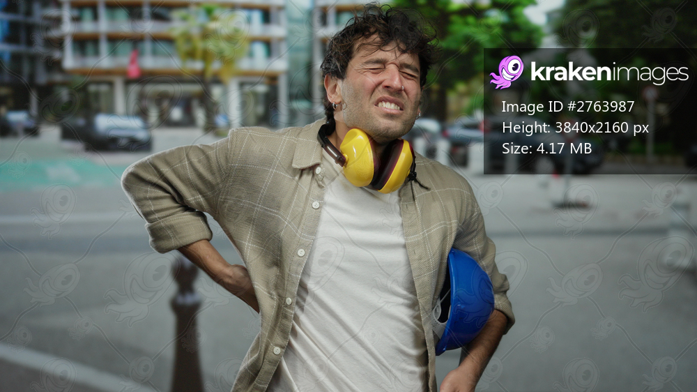 Hispanic man with headphones and hardhat stands on street clutching his back, showing discomfort while wearing casual clothing in an urban outdoor setting. - Kraken Images