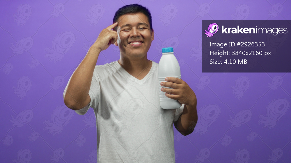 Hispanic man holding a white plastic bottle with blue cap and pointing finger to temple in purple studio; playful confidence.