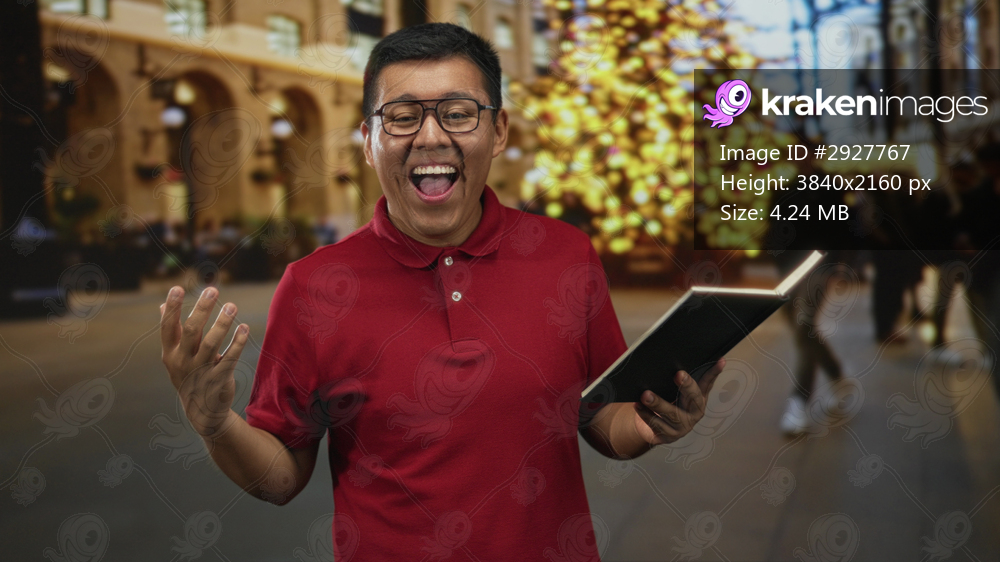 Hispanic man holding an open book and gesturing with his hand in a public building decorated with a large lit christmas tree; holiday joy.