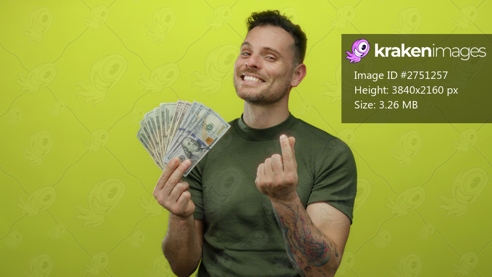 Hispanic man holding fan of dollars smiles confidently against a vivid yellow background exuding charisma and financial success while making a playful finger heart gesture. - Kraken Images